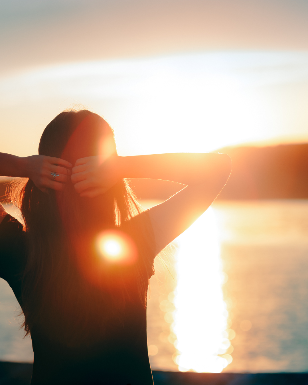 A woman with long brown hair standing in a field of tall grass during sunset, with her arms raised and open to the sky.